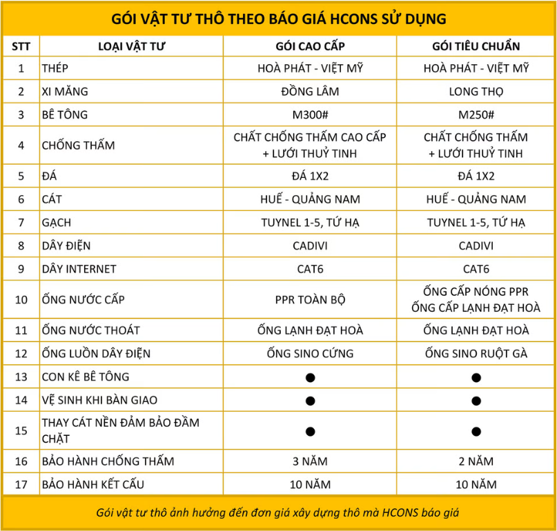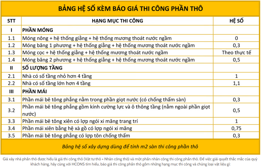 - Đơn giá thi công trọn gói phần thô của HCONS theo hình thức khoán gọn công trình.