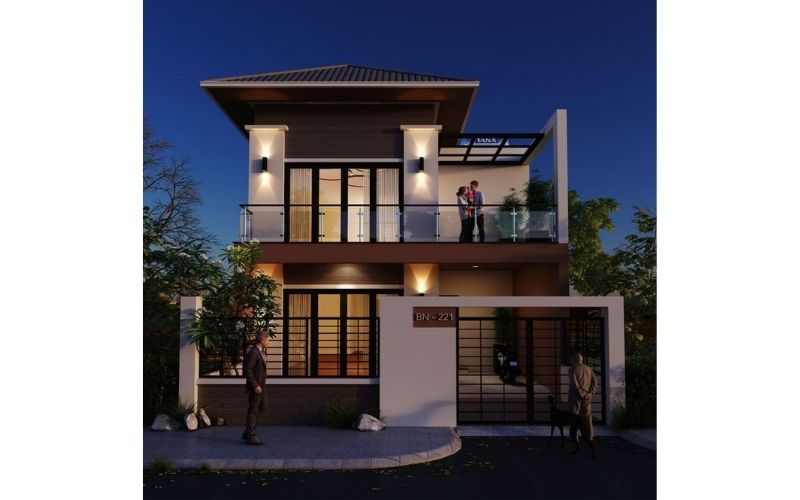 Ngôi nhà được sử dụng những vật liệu mới như gỗ, kính cùng hệ thống đèn nội thất ánh sáng vàng mang đến một không gian ấm áp. Những ngôi nhà 2 tầng ban công kính có một sự thu hút riêng biệt. Kiểu không gian vừa đóng vừa mở rất hiện đại là lựa chọn cho những cặp vợ chồng trẻ.