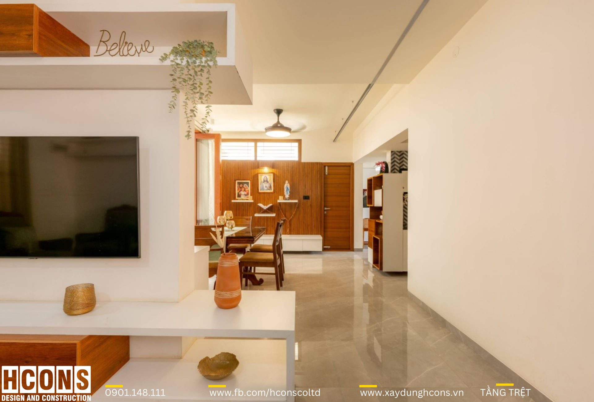 Khi bước vào bên trong ngôi nhà, mọi người sẽ ngay lập tức cảm nhận được bầu không khí êm dịu, ấm cúng nhờ tông màu đất chủ đạo. Tất cả các khu vực chức năng đều xây dựng theo bố cục mở, đường nét thiết kế gọn gàng và tinh tế.