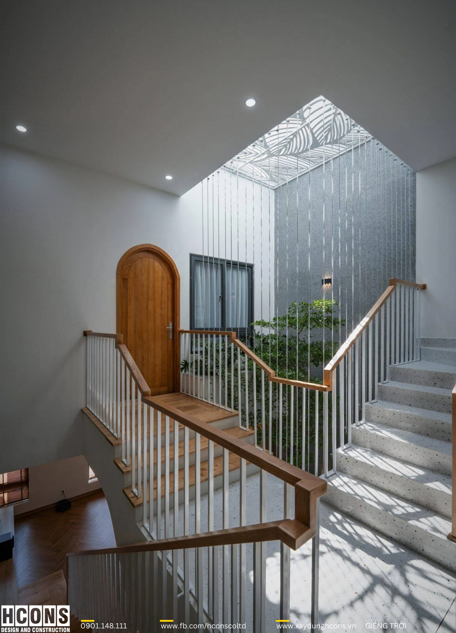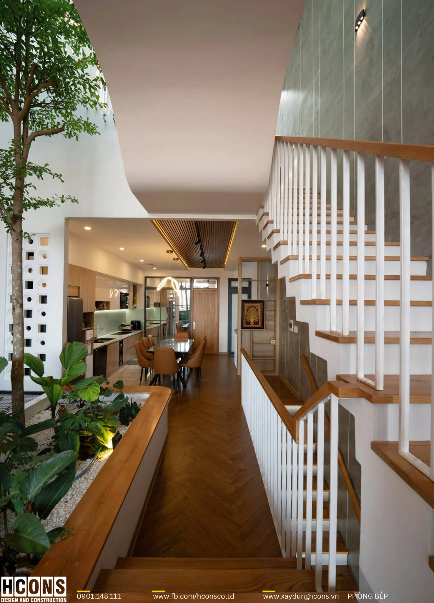 Là mẫu nhà ống điển hình nên muốn nhận đầy đủ ánh sáng tự nhiên cũng như đáp ứng nhu cầu của gia chủ về những mảng xanh, nhóm KTS đã tận dụng tối đa những khoảng không gian liên thông. Tổng thể không gian là các khu chức năng được xếp nối liền, lùi dần vào giúp tạo ra sự kết nối, người ở dưới và ở trên dễ dàng nhìn thấy và trò chuyện với nhau.