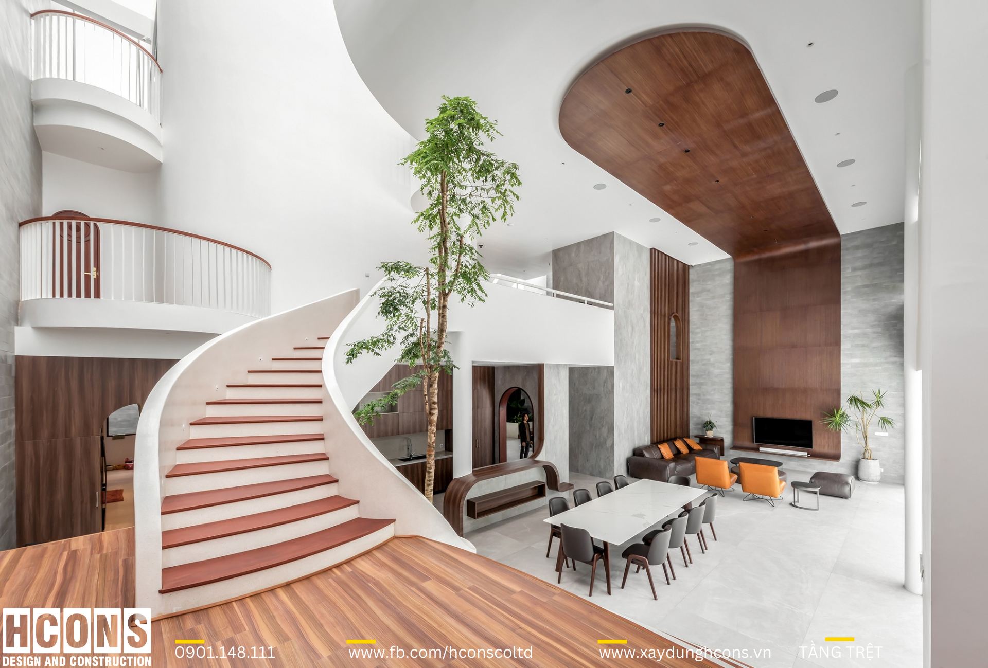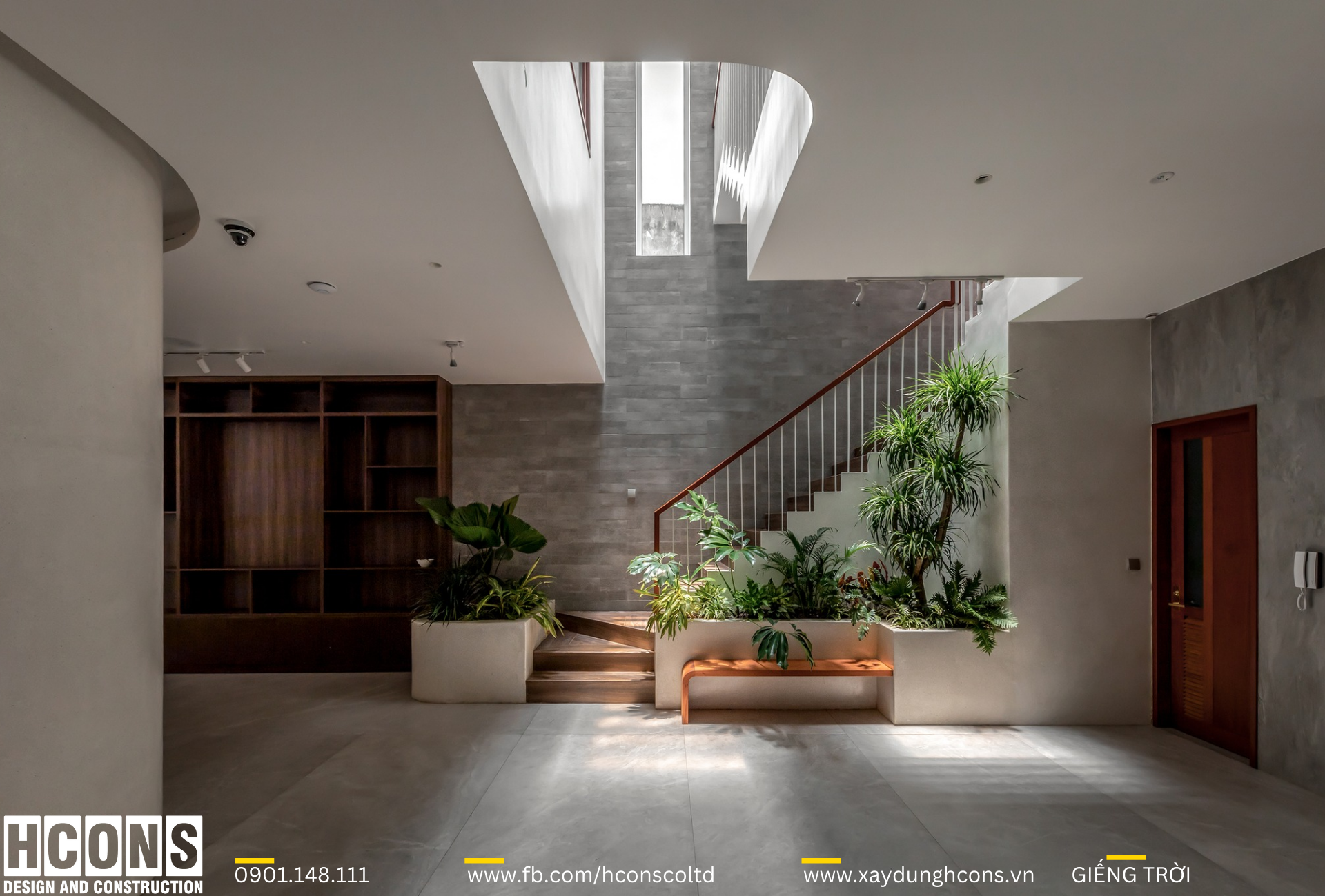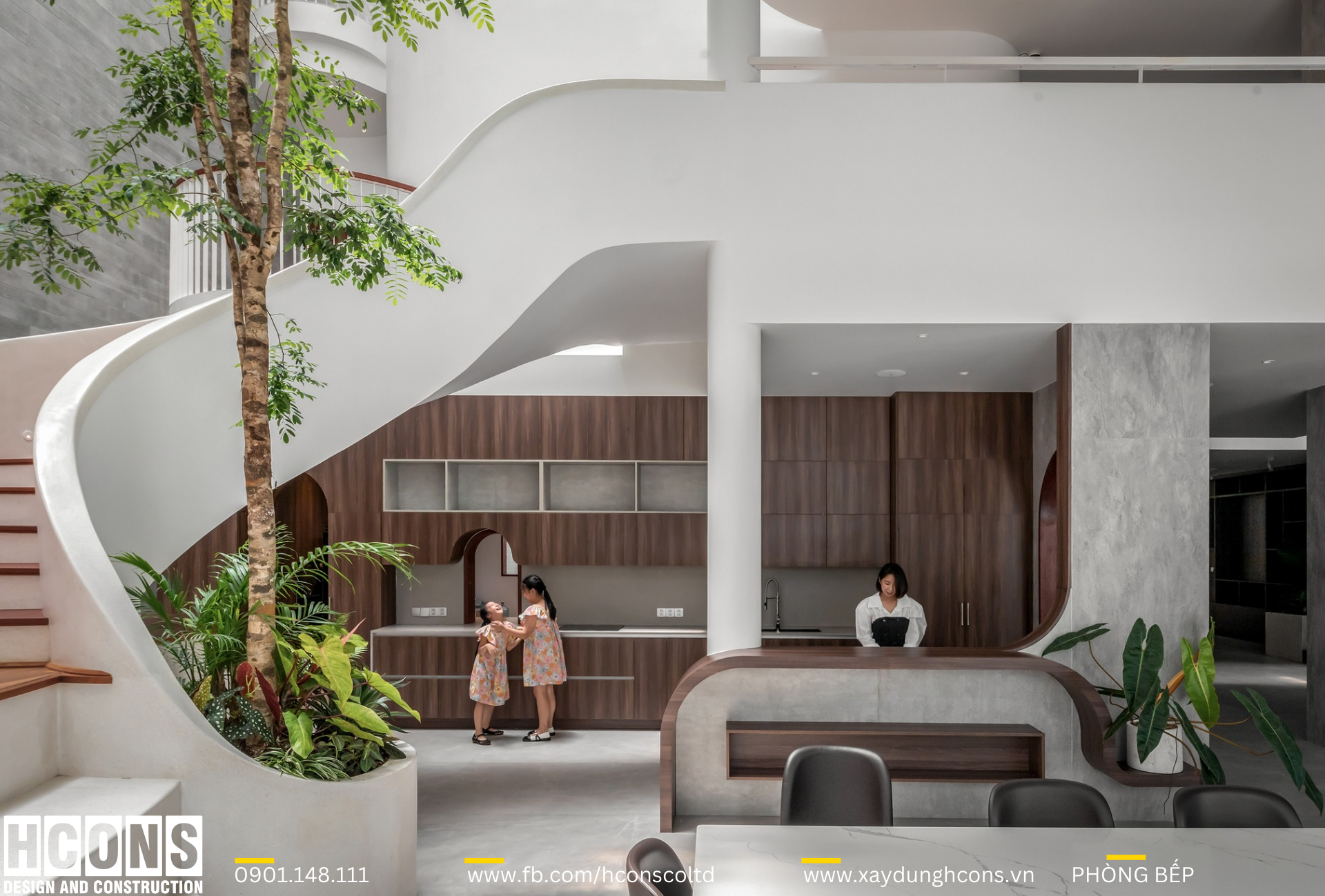 Ngôi nhà hướng đến sự hiện đại, thoải mái, đề cao sự thư giãn tốt nhất khi ở nhà. Nên từ khi bước vào bên trong ngôi nhà, từ vị trí của khu vực gara để xe, mọi người đã có thể cảm nhận được một trải nghiệm thú vị hơn với sàn nhà được trang trí bằng những hoạ tiết đường cong, các khoảng sáng thông tầng với cây xanh đưa ánh sáng tự nhiên xuống tới tầng hầm giúp không gian lúc nào cũng được thoáng sáng.