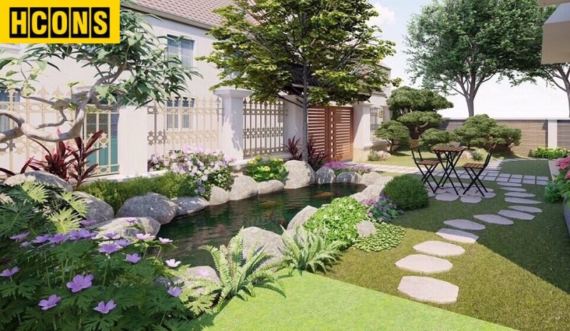 Sân vườn có hồ cá và non bộ sẽ tạo kiến trúc siêu độc đáo và nổi bật