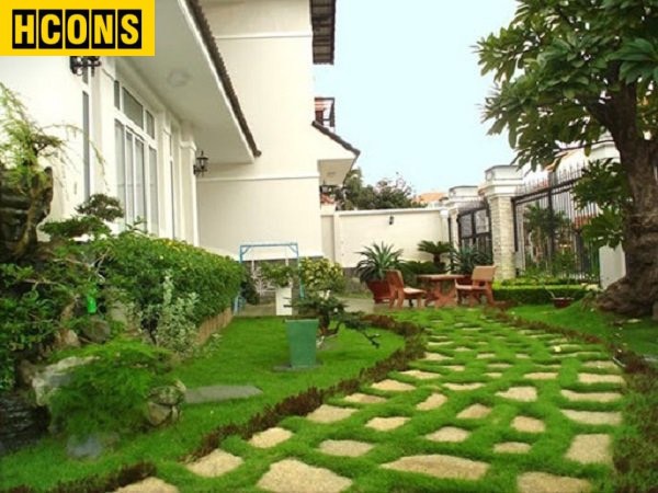 Sân vườn biệt thự có cây xanh và thảm cỏ.